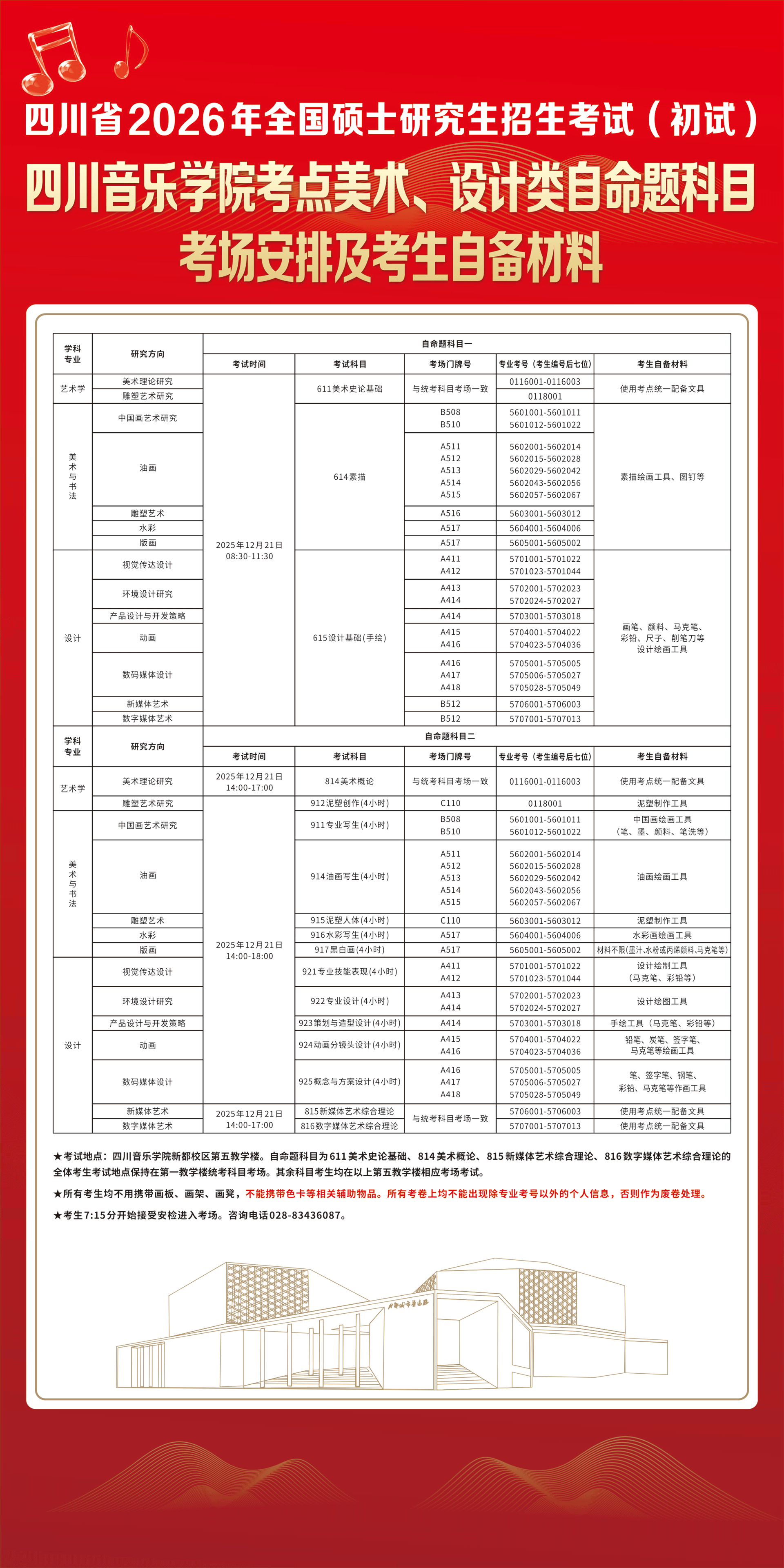 美术、设计类科目考场安排详见我校研究生处官网已发布的《四川音乐学院2026年硕士研究生招生考试(初试)美术、设计类考场安排及考生自备材料》。